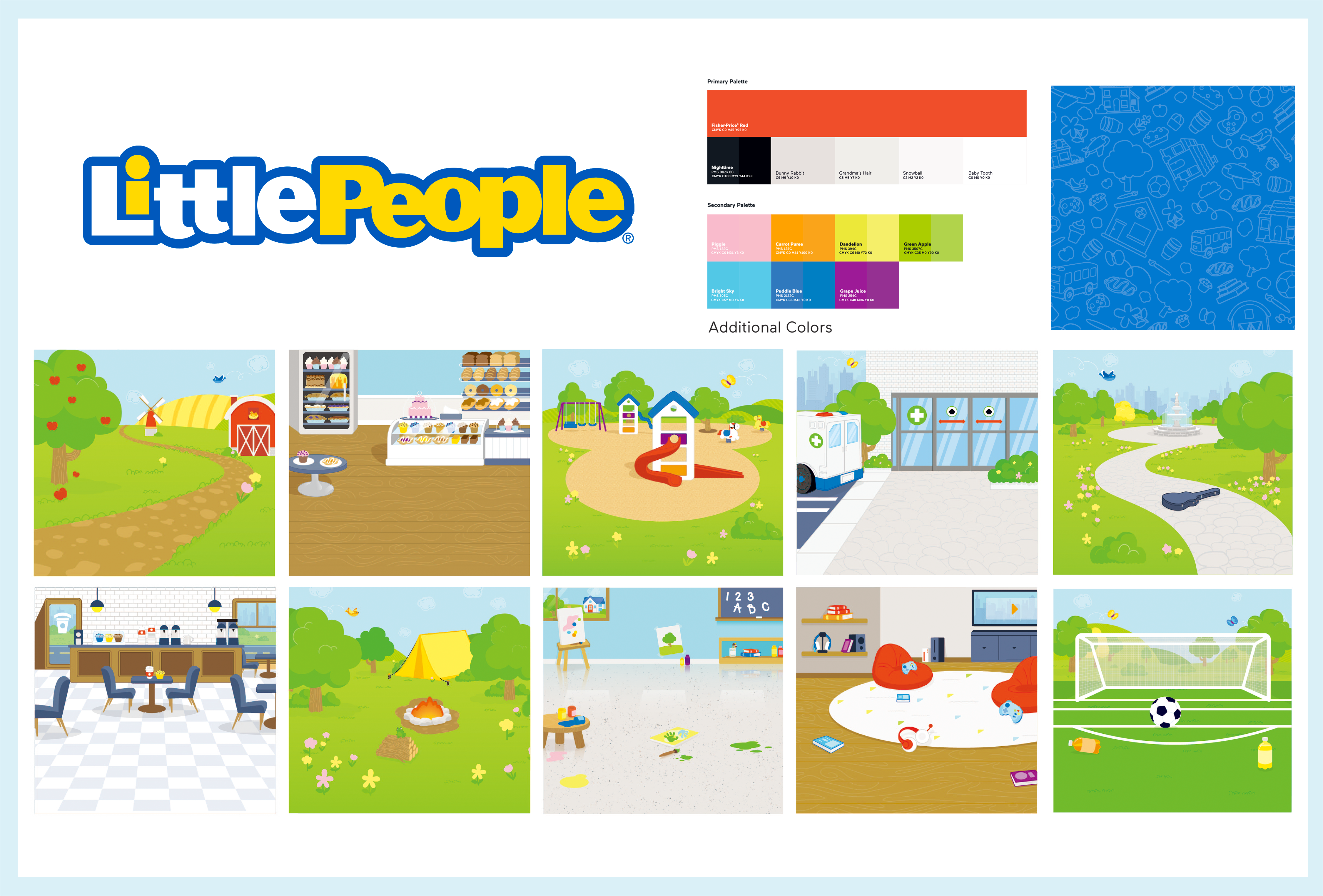 I worked with artist May Huang to refresh the character art. We replaced grey tones and dark shadows with warmer tonal shading. Eye shape became more oval and highlights were incorporated to add sweetness. We made these changes to all existing art. Previously only characters from our youtube content were used on packaging; we decided going forward to expand the world of Little People by creating new art for the figures included in each new playset or figure pack.